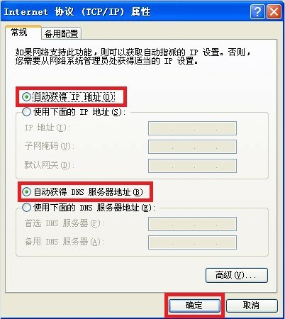 5.选择“自动获得IP地址”、“自动获得DNS服务器地址”,点击确定即可: