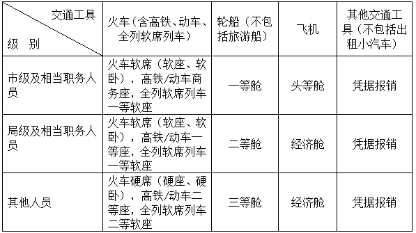 第八条 出差人员应当按规定等级乘坐交通工具。乘坐交通工具的等级见下表:
